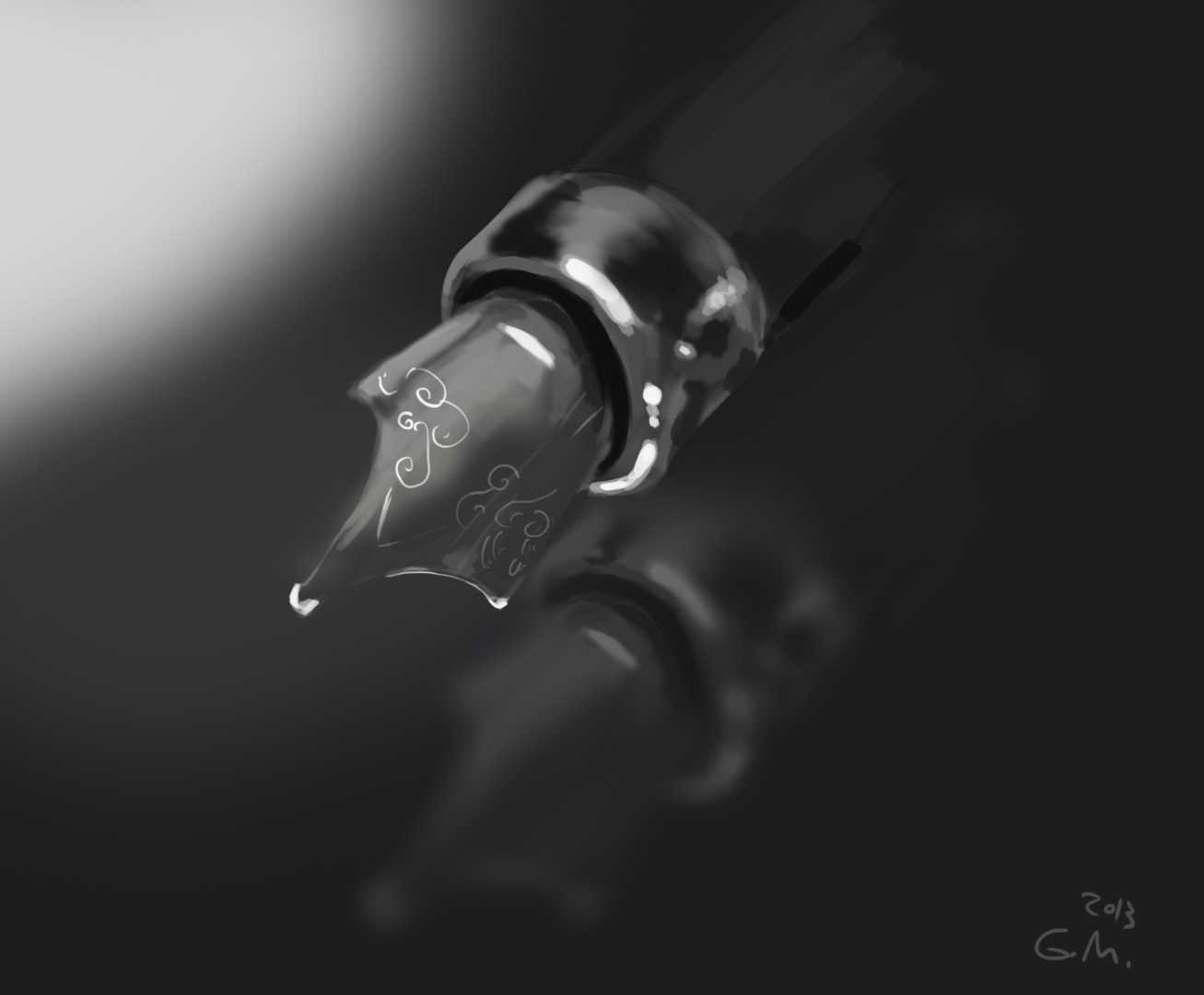 I’m slowly trying to work on my weakness of creating convincing shiny surfaces so for today’s 30 min warm up I did this traditional ink pen study. I figure if I keep hacking away at shiny stuff in small chunks I’ll get it much more solid in a few months. Also Photoshop CS6 has some pretty neat Blur filter now. Field Blur
