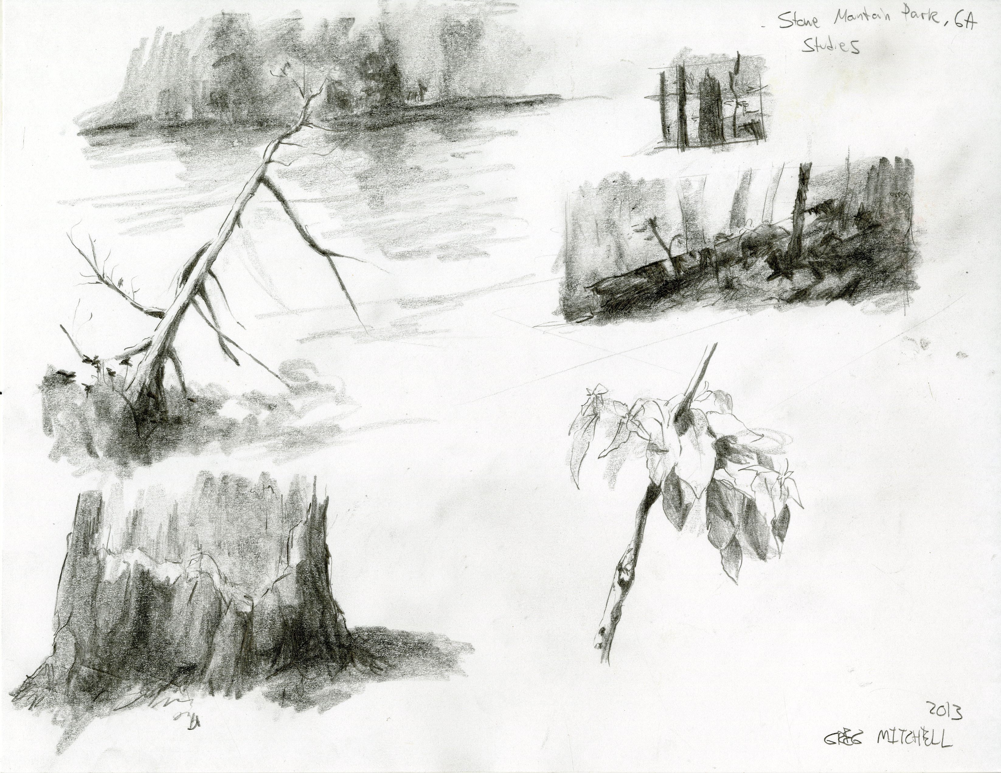 For today’s landscape drawing class we met at Stone Mountain to take pictures and do some sketches for our next study. It was a beautiful day out and I got to listen to a gaggle of old people complain about Wal-Mart as I drew for an hour hahaha.
