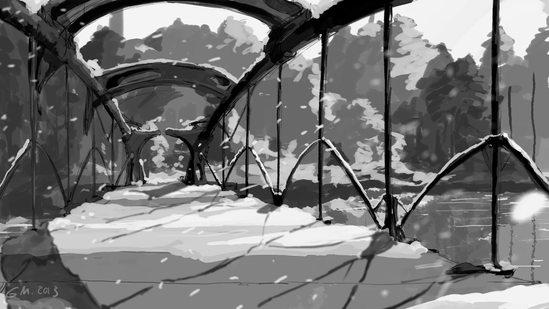 My assignment for class was to do a scene at the covered bridge in Stone Mountain and she said we could add some fantasy elements to it. Well I did hahaha.I’m still working on rough values on this composition sketch. I’ve got to clean up the line work and start this painting. With so much curvy architectural designs it taken some time to map out right but it’ll be done soon though.