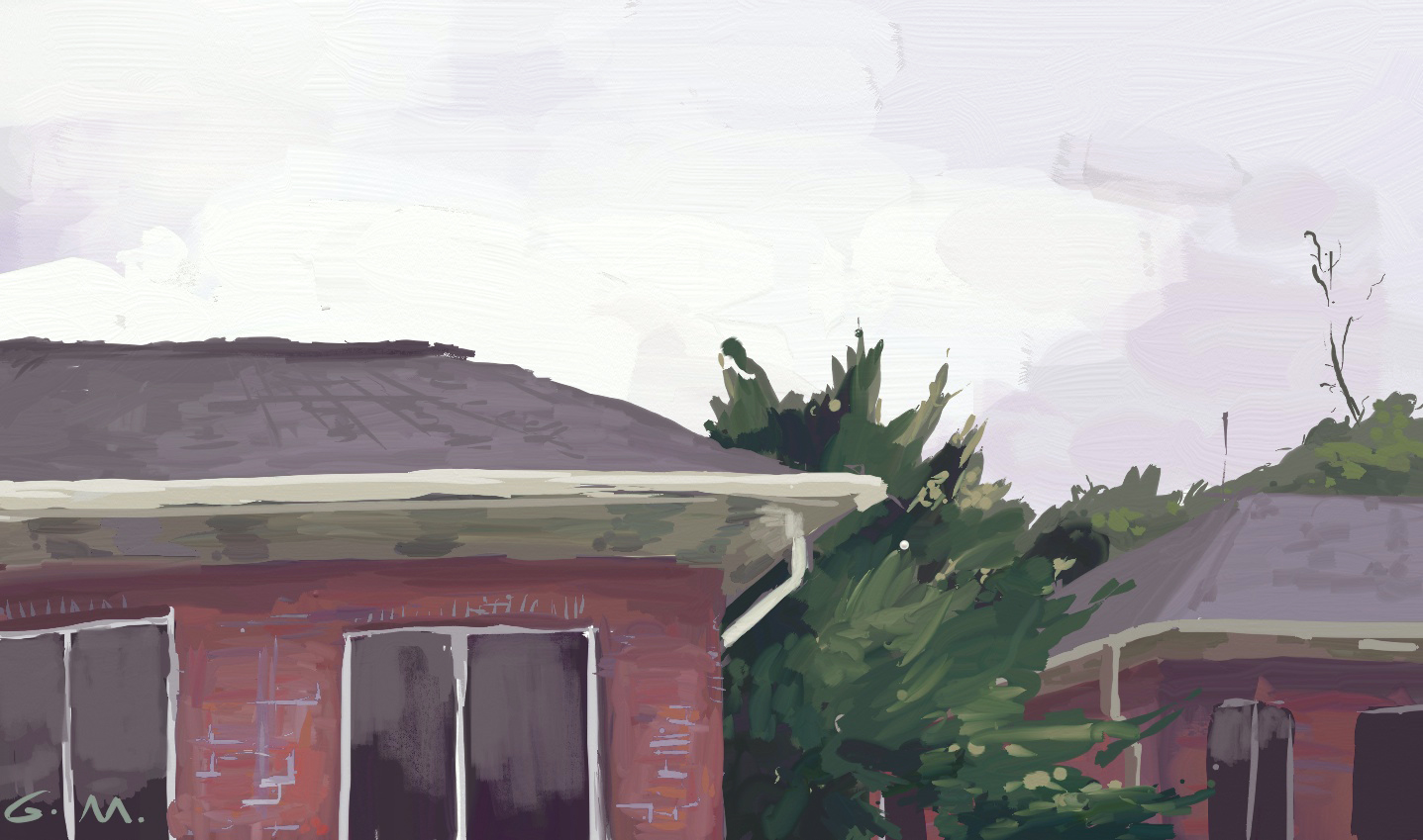 Lately I’ve been doing a lot of studies from other artist works but now I’ve gotten to the point where I can move on to doing my own. Today during my lunch break I decided to do a digital painting of what I could see out of the window. Unfortunately even though its the summer someone angered Poseidon and everyday has been grey and rainy therefore leading to this piece having little light interest. Oh well hahaha
