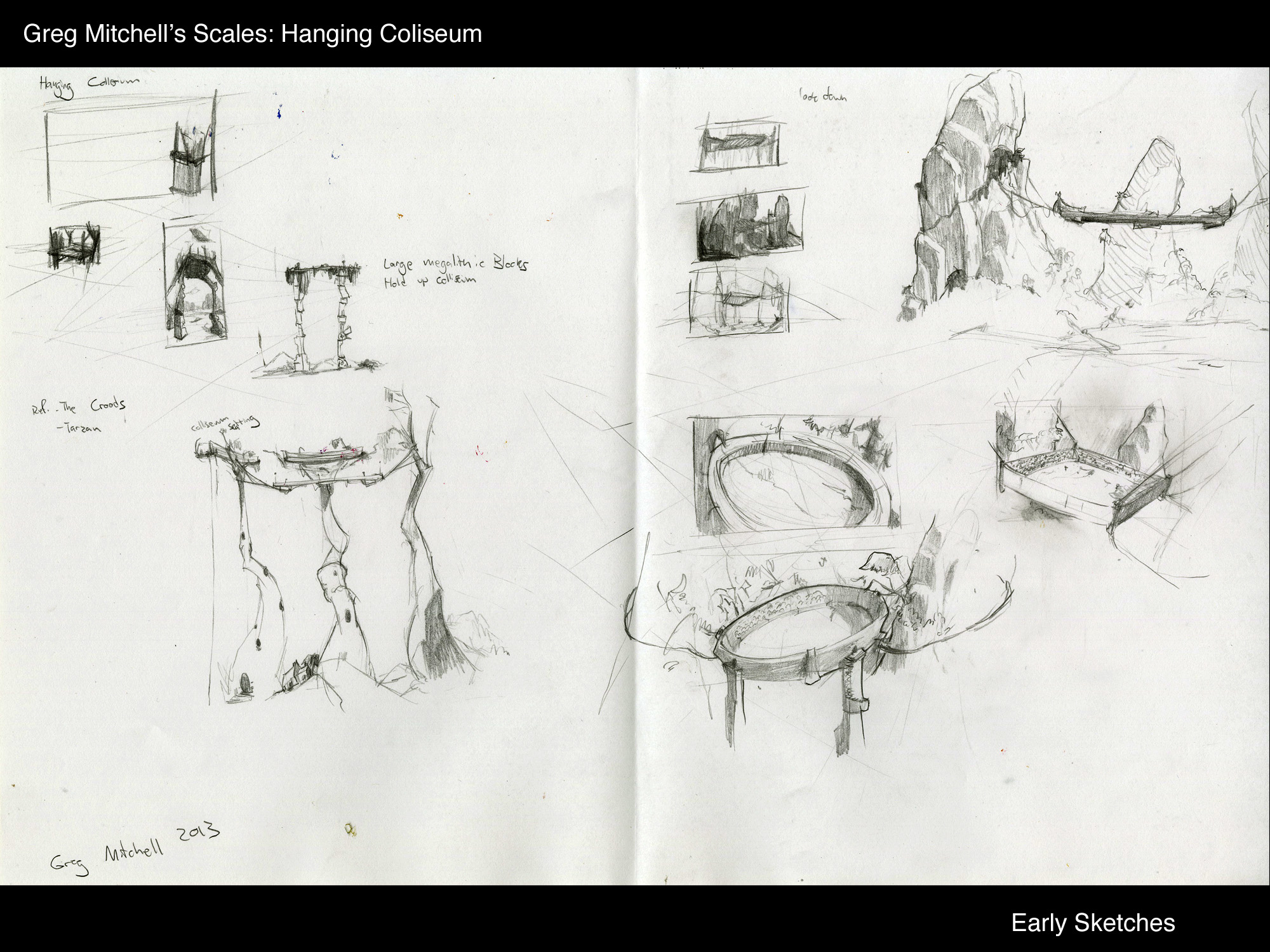 I was fortunate enough to take Armand Serrano’s Environment Sketching for Production class online. The techniques and skills I learned in 8 weeks could have easily taken me years. Because of the tight deadlines in the class I was never able to produce something that I was “happy” with but I did do a lot of pieces that helped me in my learning process. My main environment for that class was something I called “The Hanging Coliseum.” I’ve always loved the grandeur of the coliseum and I wondered how neat it would be if it was suspended mid air…It wasn’t easy and it’s still certainly not perfect but I did have some decent attempts at the location. I would highly recommend this class to anyone that wants to really know the ins and outs of environmental art ( and regular art). Here are some of my favorite pieces from the class!
