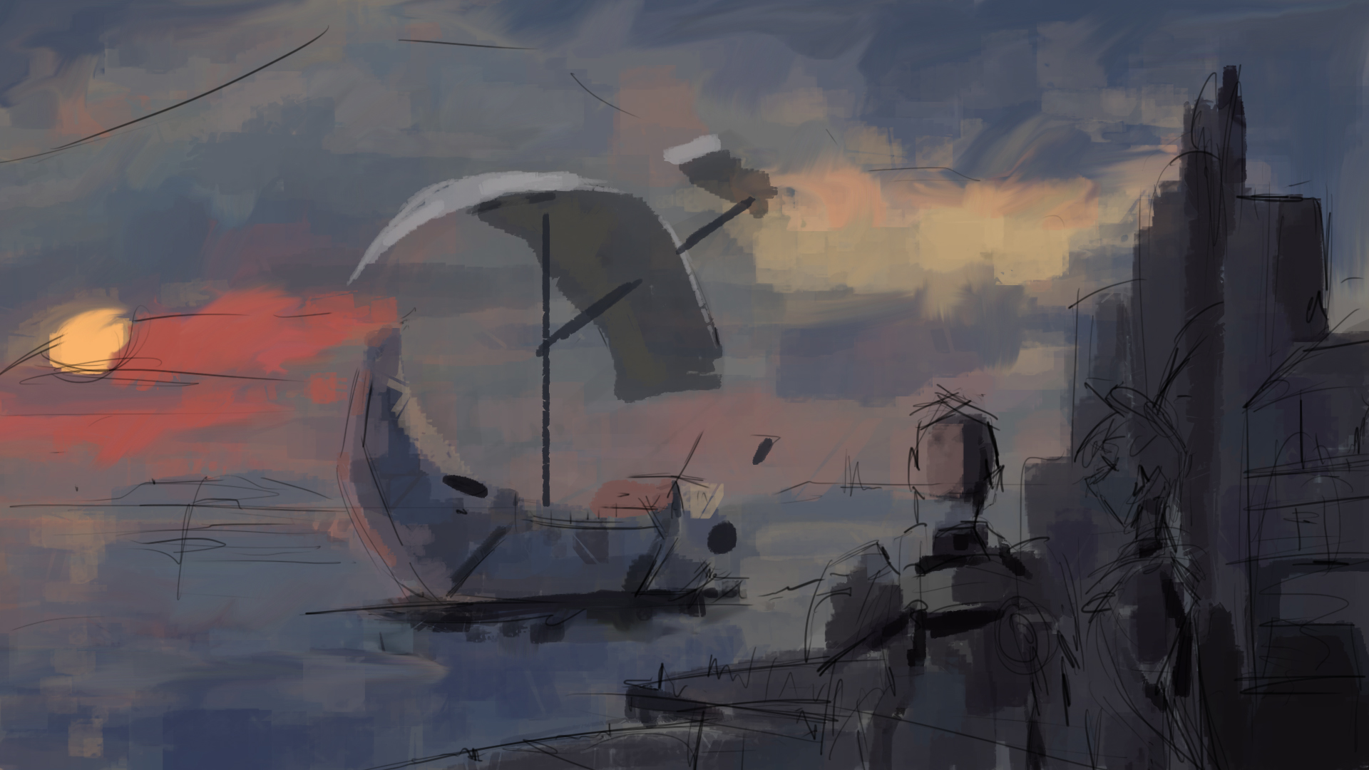 I’ve only just laid down the base tones for this one but I’m already pretty excited about it. It will be a beautiful futuristic ship reflecting the water. I’ve been working on development for what the ship will look like that I’ll post soon.