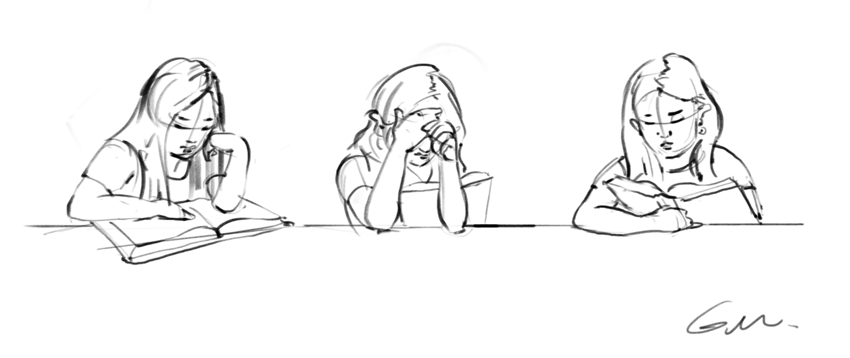 Man I’m scrolling through my blog and it’s looking pretty damn bland and boring. Study, study, life drawing, study. Don’t worry guys, I’ve been cooking up a world of original content lately and I’m taking my time before I present my real material. In the meantime, just be happy with what I do to warm up each day. These are sketches of people at the library reading books and such.