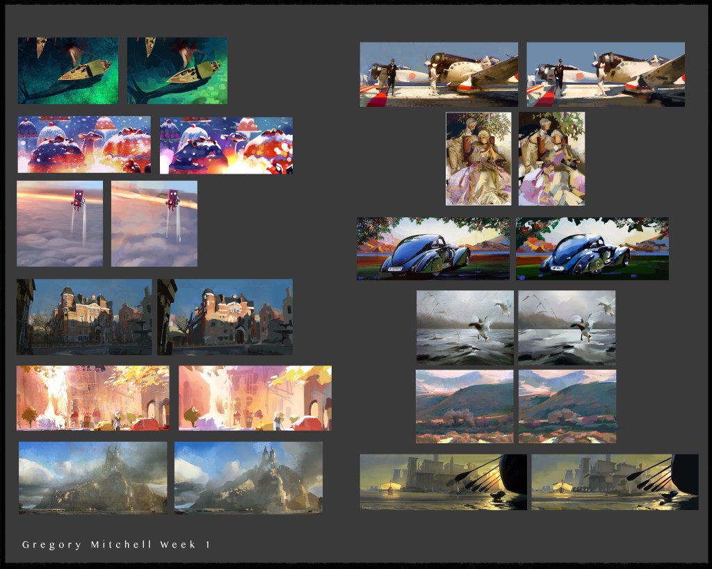 Recently I’ve had the opportunity to take an online class with one of my all time favorite artists, Nathan Fowkes. His sense of color and light has dazzled me for years and has been a bench mark for my growth. I just recently completed last weeks first assignment which I’d like to share here. We had to do color studies from paintings that we liked. My studies are the ones on the right. I struggled with having distracting values and an unclear sense of purpose. I only got a 3 out of 5…womp womp but I’m excited to learn and improve! I look forward to stepping up my game in this class so that I’m not a joke. Those other students are actually pretty damn good low key- high key.