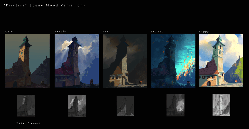 This week in my online class I did a little better than before (4 out of 5). I spent a bit more time tightening things up and grouping the values though I could have pushed for more extreme colors. The assignment was to pull out five different emotions from a sketch and as I reached for more extreme palettes I had a hard time connecting to it emotionally. That said I’ll still make sure to provide more variety in the future instead of leaving things mostly cool hued. This marks an exciting point in my artistic career because I feel like I have the tools to breathe life into my old zany whimsical projects that my artistic skills couldn’t quite produce before. I’ve decided to group a number of my past ideas into one super fantastic epic adventure called “Paper Bag Boy!!!! (this version is way better than the previous takes with no exclamation marks).” I’ll use the rest of this online class to flesh out ideas for this project. Well that’s it..toodles.