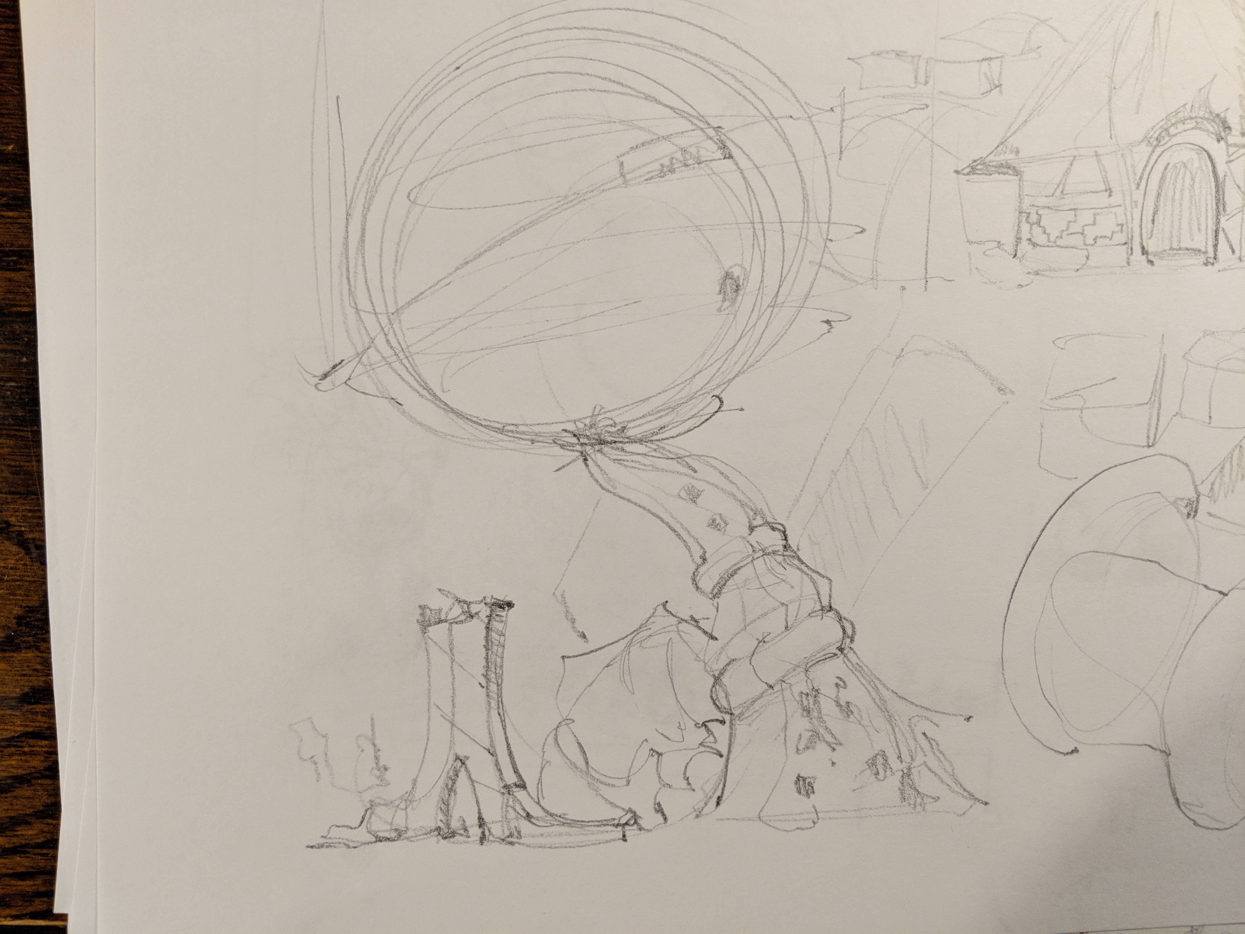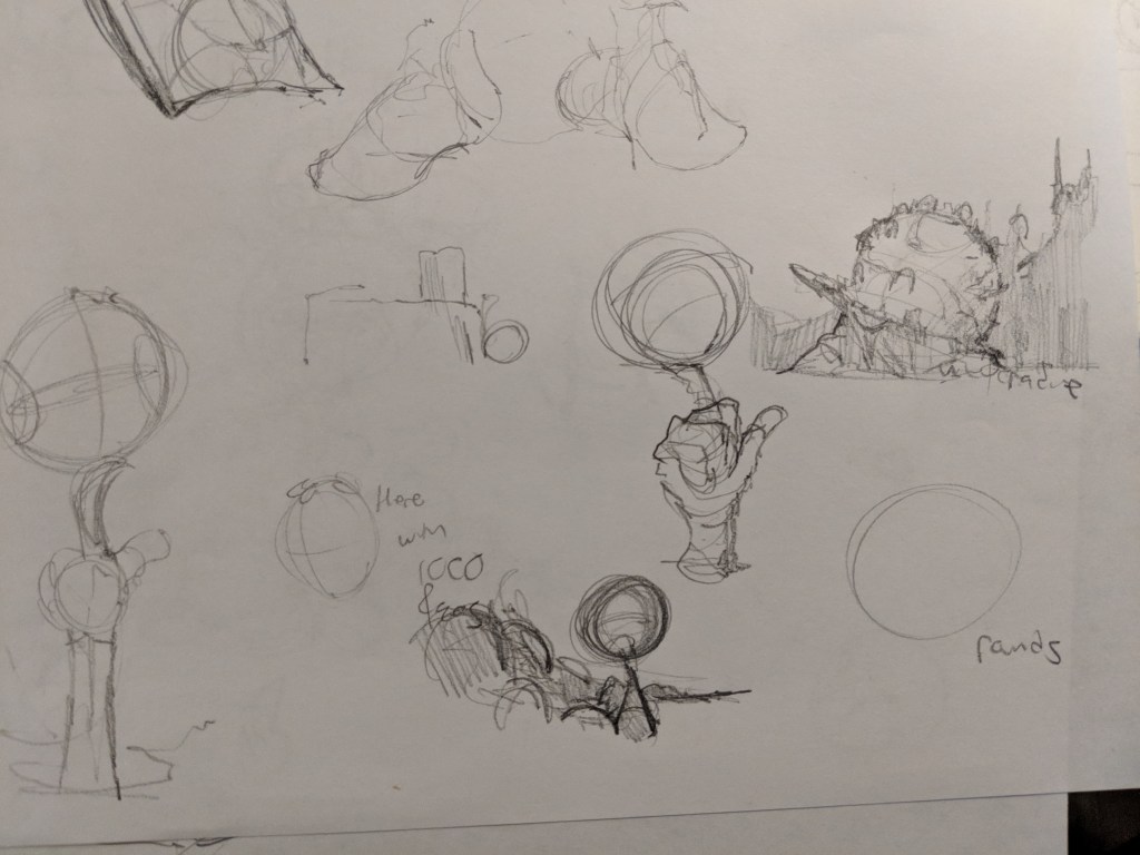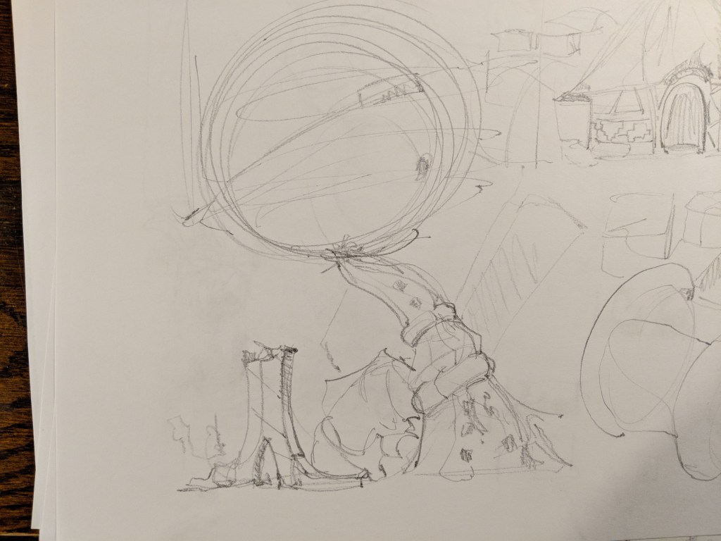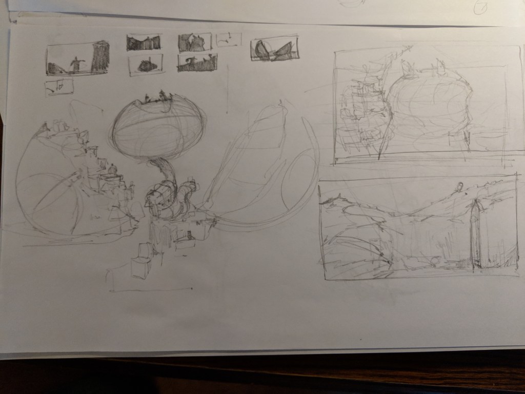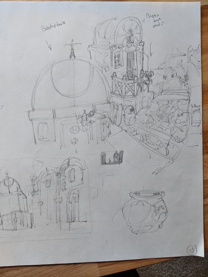 Ok, so I haven’t been updating my site with my class updates because I haven’t really liked any of them. This last assignment is a large piece that should represent me as an artist. I had to really think about that. At first I just came up with some simple ideas that would make for good paintings. Yes, they would be good but not great/inspiring. Me as person is similar to me as an artist. My personality is big and exciting like a turn up rap song and I want my audience to feel that way too. I think it’s important at this stage in my career to really channel my Purpose, Personality and Design in my personal work to allow my pieces to transcend the horde of mediocrity that exists on socials. Everyone can draw, everyone can paint but few can think. The amount of originality I see online is staggeringly low and I simply won’t be a part of that. So for this assignment I went back to the pages of 2014 Greg and created a larger than life project environment called “Ballers Paradise.” It’s an imaginative civilization that worships basketball that takes Oia Greece and gives it African influences. Most of my sketches for this project have been rough idea doodles but I’ll be updating my site with a series of full images to articulate this location soon. From now on I’ll be putting enough love into all of my projects to make my audience dream bigger when they see it and be taken to a place where their child selves are allowed to run free! Here are a some pages of thinking I’ve done on this project.