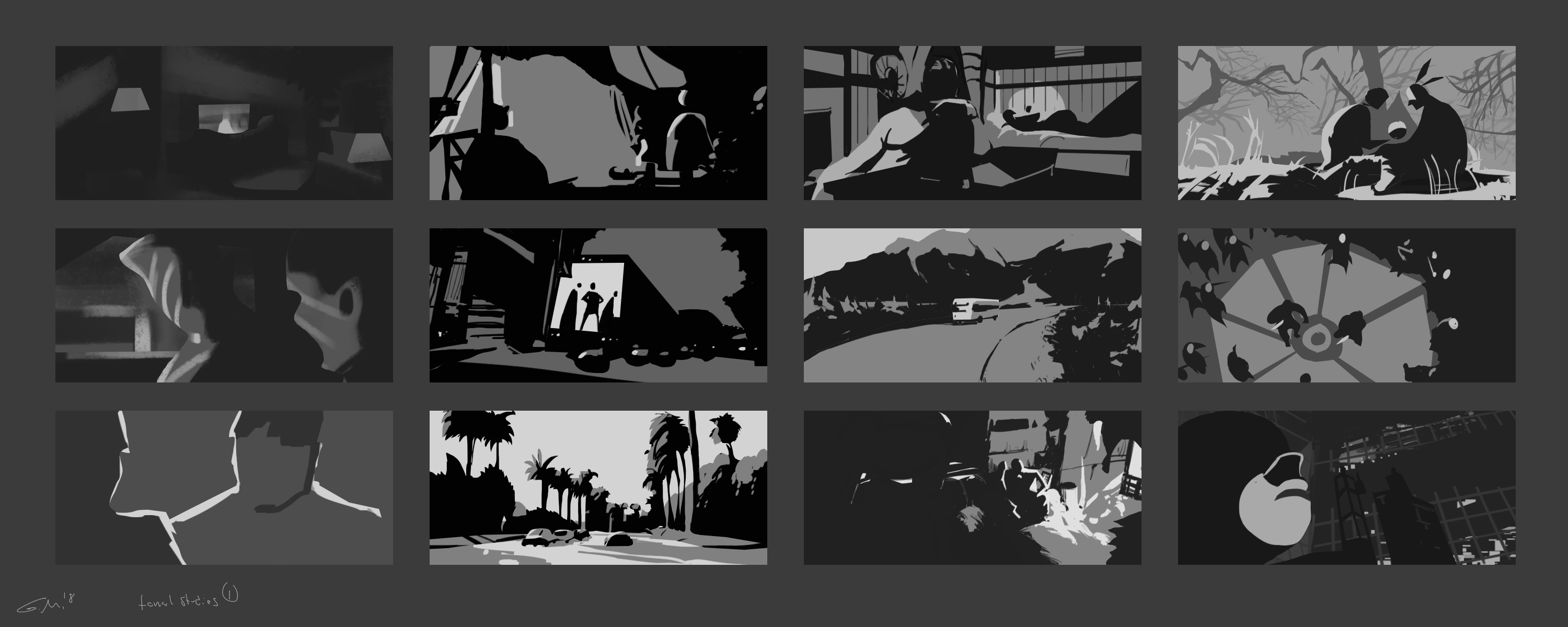 A full plate of simplified tonal compositions. I’m really enjoying creating custom brushes to stream line the economy of certain edges like branches or scaffolding. More to come.